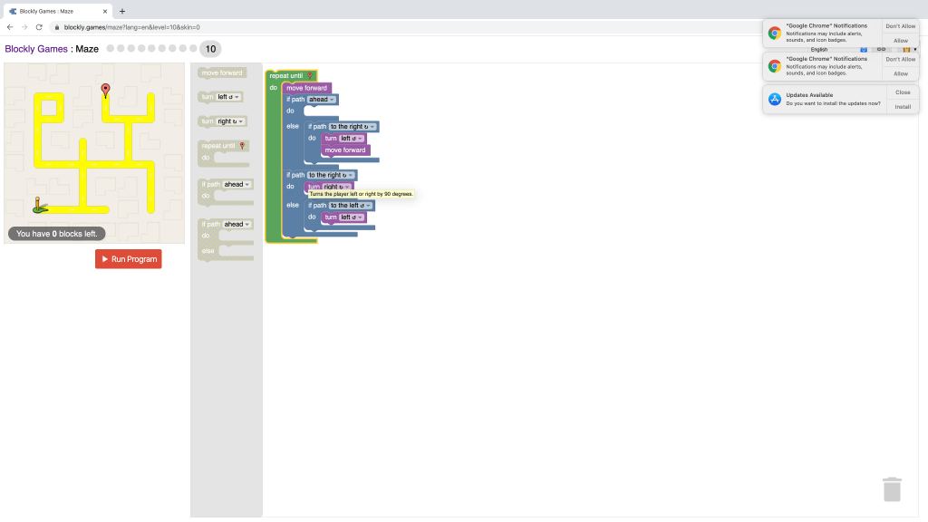 I completed the maze on blockly games, at the first eight levels are really easy but the last two were very difficult. The last level was very difficult and I did it with a help from my friend, I helped him and he helped and together we completed. It was a lot of fun to do the Maze!